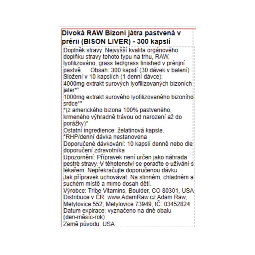 - Masivních 4000mg mrazem sušených bizoních jater a 1000mg mrazem sušeného bizoního srdce na denní dávku (10 kapslí)