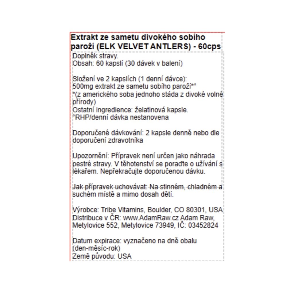 | Složení denní dávky (2 kapsle): | 500 mg extrakt ze sametu sobího paroží (z amerického soba jednoho stáda z divoké volné přírody), želatinová kapsle. |
