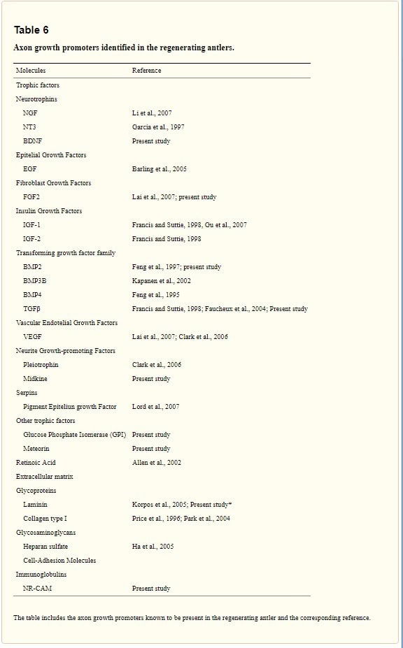 Bylo prokázáno, že samet paroží obsahuje IGF1 a IGF2. Tyto hormony jsou důležité pro růst a opravu všech druhů tkání v lidském těle. Pomáhají také regulovat buněčný vývoj. Najdeme v něm však také nervový růstový faktor (NGF) a neurotrofin-3, které pomáhají stimulovat růst nervových vláken a působí na nervové receptory. Pak je tu mozkový neurotrofický faktor (BDNF), který podporuje růst a přežití neuronů! Dále fibroblastové růstové faktory a vaskulární endoteliální růstové faktory. Ty jsou obzvláště důležité pro pojivové tkáně a cévy. Dále pleiotrofin, který je známý i pod jinými názvy, včetně heparin-vázajícího růstového faktoru 8 a faktoru podporujícího růst neuritů 1. Kostní morfogenetické proteiny jsou zase důležité pro tvorbu chrupavky a kostí. Transformační růstové faktory zahrnují regulaci zánětlivých procesů, zejména ve střevech, diferenciaci kmenových buněk a regulaci a diferenciaci imunitních T-buněk. Jak ukazuje tento známý graf z výzkumů paroží, tyto a další růstové faktory jsou přítomny v rostoucím paroží vždy. Je jasné, proč naši předkové začali tuto látku používat. Parohy rostou každý rok a rychle, a proto mohou očividně pomáhat při regeneraci chrupavek, svalů, kostí, pojivových tkání, cév a nervů..